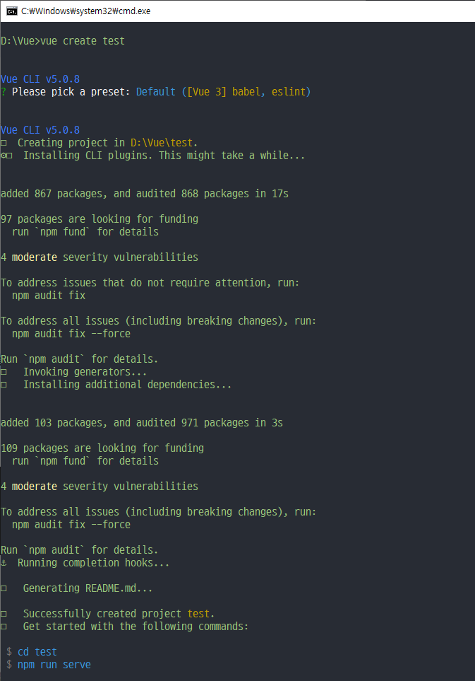 *? Please pick a preset: Default ([Vue 3] babel, eslint)가 출력된다면 Enter