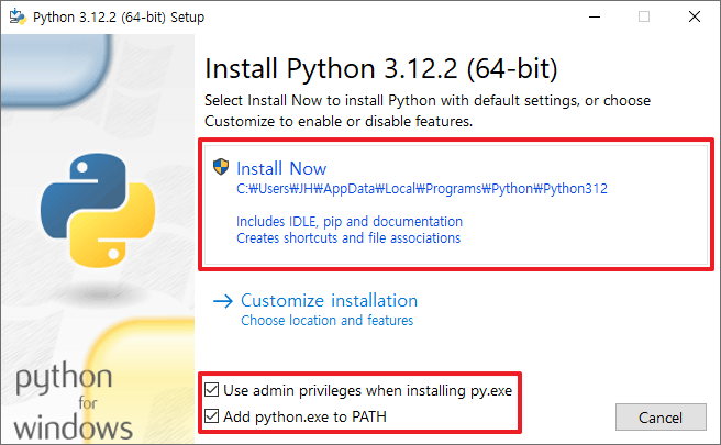 *Use admin privileges when installing py.exe : 설치 시 관리자 권한 사용(py.exe : 코드 실행기)