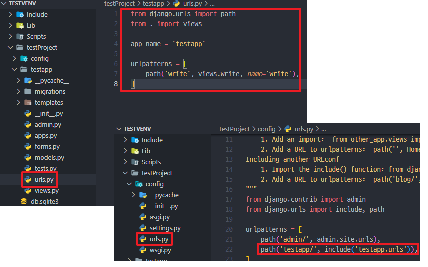 *App urls.py에서 URL을 설정하고, 설정한 파일을 Project에서 include 해서 사용