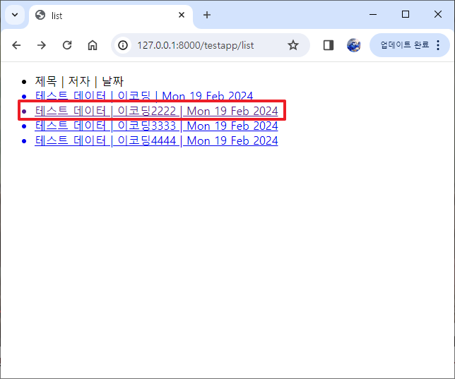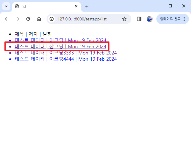 | Django 기초 예제 - 게시판(글목록) (0) | 2024.02.15 |