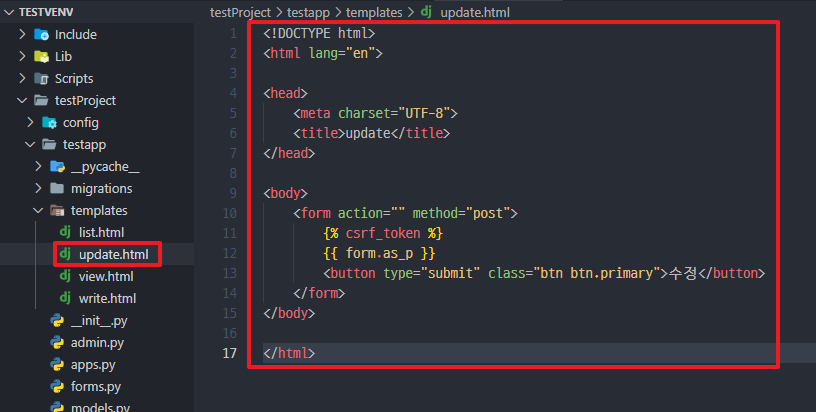*Views에서 Form에 미리 데이터를 채웠기 때문에 {{ form.as_p }} 으로 생성 가능