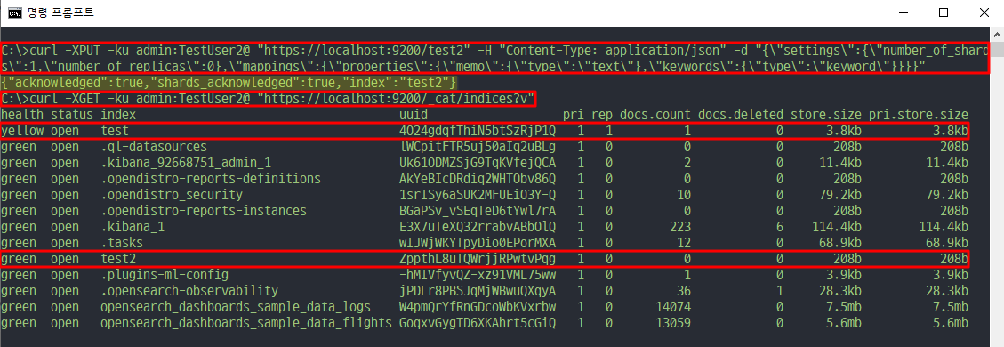 💡curl -XPUT -ku admin:TestUser2@ "https://localhost:9200/test2" -H "Content-Type: application/json" -d "{\"settings\":{\"number_of_shards\":1,\"number_of_replicas\":0},\"mappings\":{\"properties\":{\"memo\":{\"type\":\"text\"},\"keywords\":{\"type\":\"keyword\"}}}}"