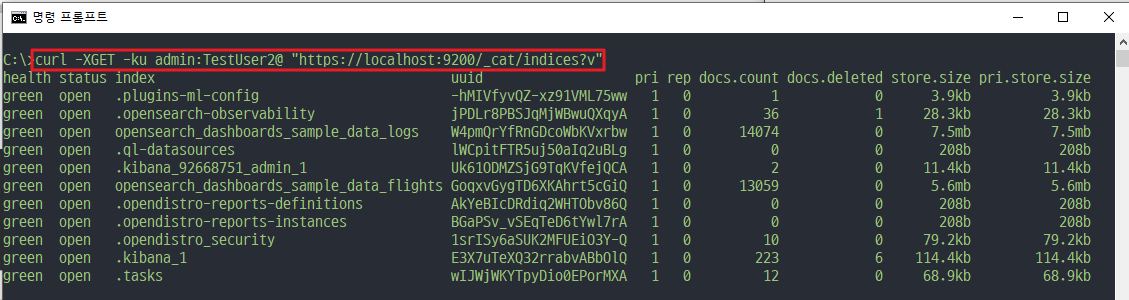 💡curl -XGET -ku admin:TestUser2@ "https://localhost:9200/_cat/indices?v"