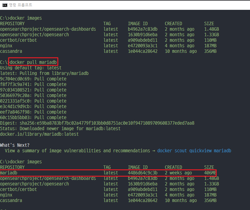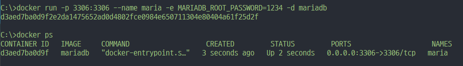 docker run -p 3306:3306 --name {컨테이너 이름} -e MARIADB_ROOT_PASSWORD={비밀번호} -d mariadb