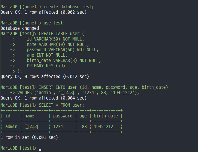 VALUES ('admin', '관리자', '1234', 83, '19451212');