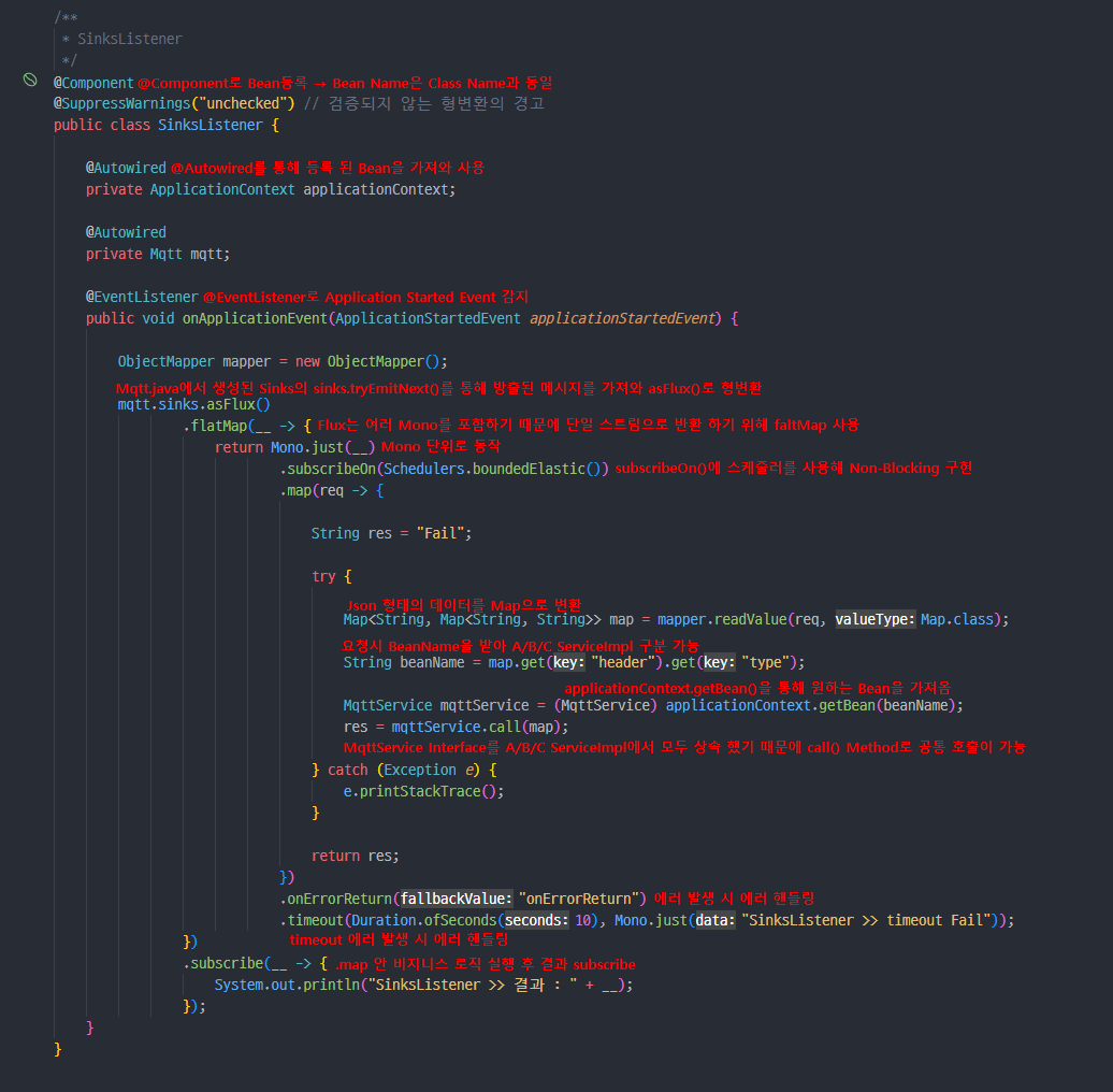 EmitterProcessor가 @Deprecated 돼서 Sinks.many()로 대체 사용 *EmitterProcessor 내부에서 Sinks를 사용하고 있음 *Processor : 처리 단계를 나타내며 발행자 인터페이스와 구독자 인터페이스를 모두 상속 *자세한