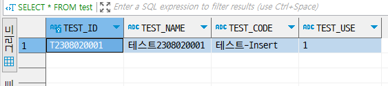( 'T2308020001', '테스트2308020001', '테스트-Insert', '1')