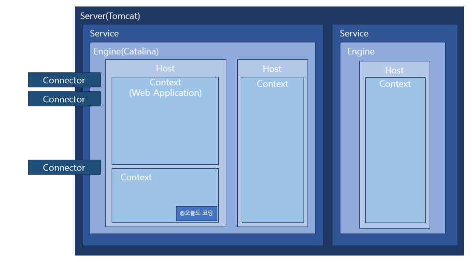 *Service는 Catalina Servlet Container 전체이고, Service 하나에 1개의 Engine과 여러개의 Connector로 구성
