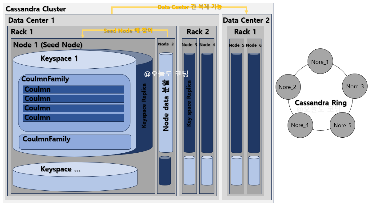 | Node | - Cassandra의 단일 인스턴스(하나의 server) - Master less - Node는 Gossip Protocol을 통해 서로 통신 - Seed Node는 Cassandra Cluster의 정보를 알려주는 Node(Gossip) *여러 개의 Seed Node 지정 가능 |